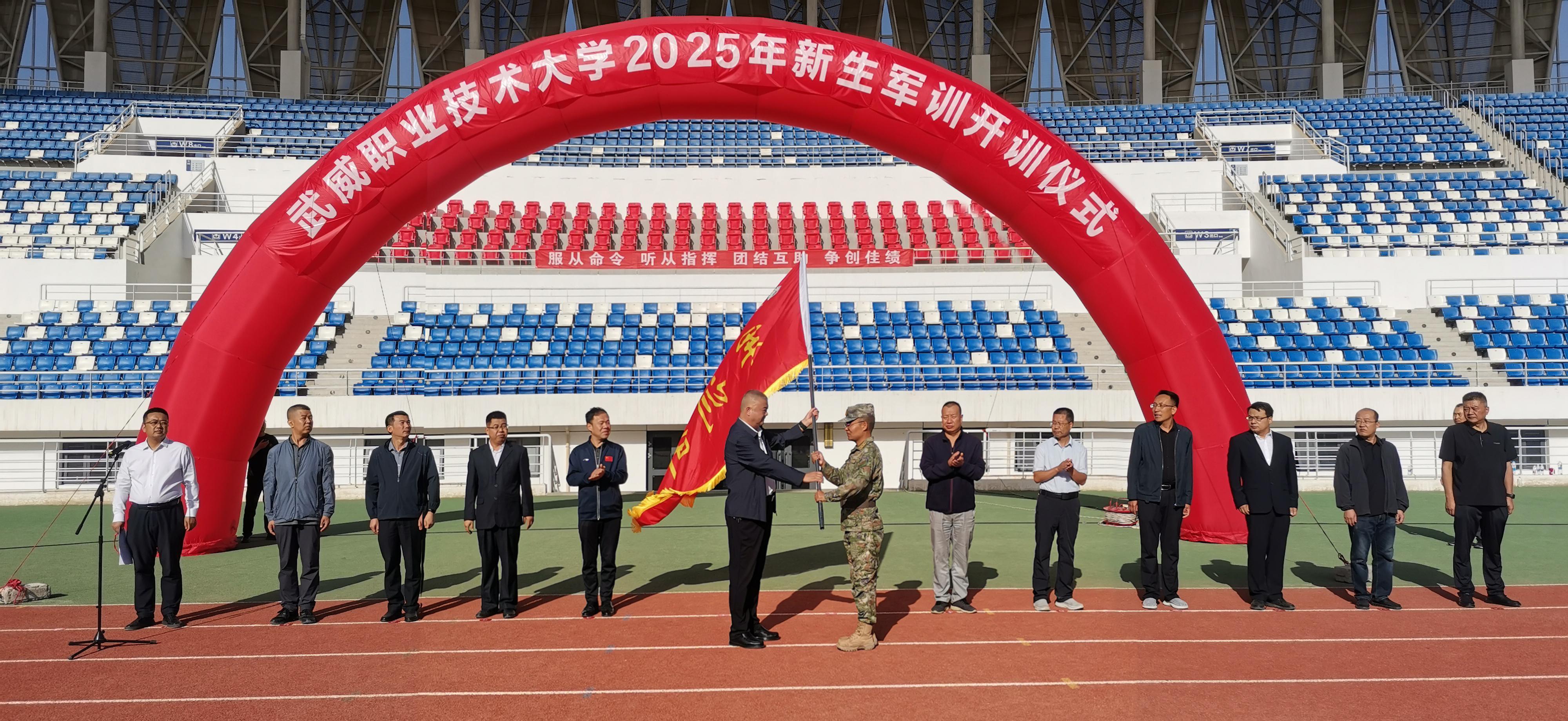 儀式最后,王守云代表學(xué)校向軍訓(xùn)團(tuán)授旗,并宣布“武威職業(yè)技術(shù)大學(xué)2025級新生軍訓(xùn)開訓(xùn)”,2025級新生軍訓(xùn)正式拉開序幕。