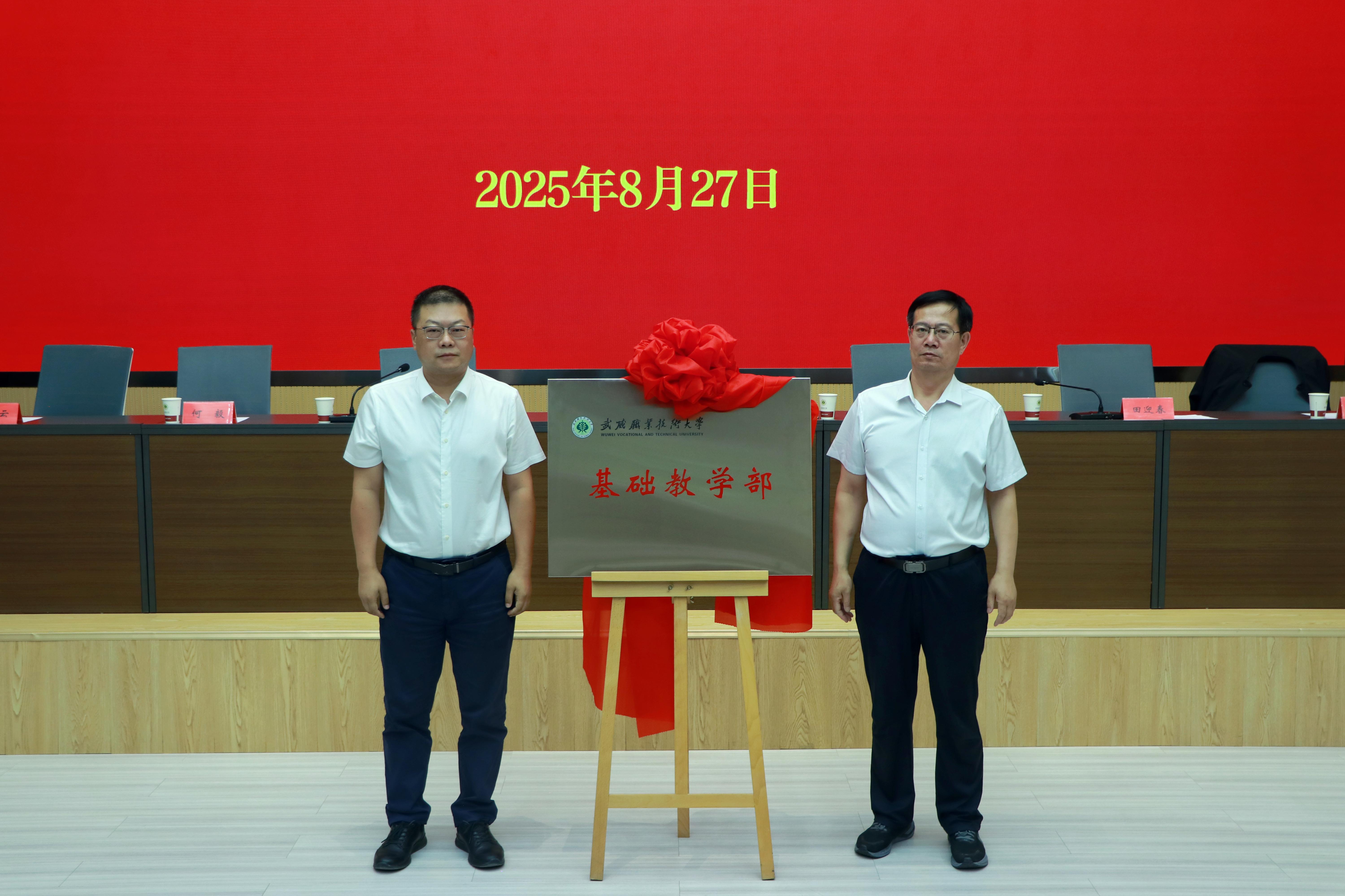 在全場熱烈的掌聲中,李海軍與張開禮共同為“基礎教學部”揭牌,標志著武威職業(yè)技術大學基礎教學部正式組建成立。